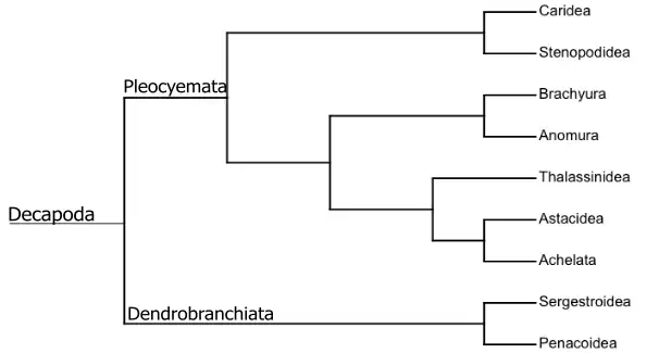 Árvore filogenética dos grandes grupos de Decapoda, produzida baseada no artigo Phylogeny of Decapoda using two nuclear protein-coding genes: Origin and evolution of the Reptantia. Molecular Phylogenetics and Evolution.[8]