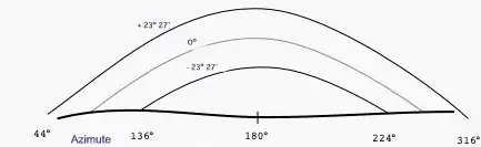 Devido à variação da duração do dia em cada latitude (excepto no equador), e como o Sol mantém a mesma variação angular horária (360º/24h = 15º/h), o azimute onde o Sol aparenta nascer e pôr-se tem de variar. Essa variação faz com que o Sol aparente mover-se sobre o horizonte, a amplitude do movimento dependendo da latitude do lugar. Para a latitude de 56º N, a variação azimutal é a constante na figura acima (à direita).