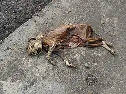 Cadáver de um gato, já em avançado estado de decomposição.