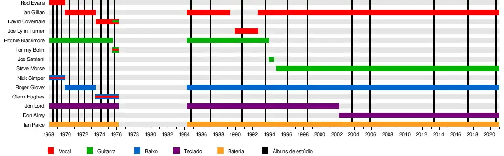 | Ex-integrantes | Ritchie Blackmore Jon Lord Rod Evans Nick Simper David Coverdale Tommy Bolin Glenn Hughes Joe Lynn Turner Joe Satriani Steve Morse |