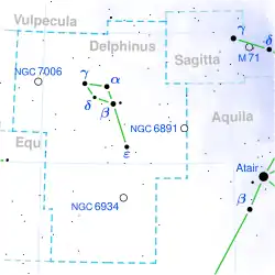 Delta Delphini - é uma estrela binária visual com período orbital de 40.58 dias e magnitude aparente de 4.43[3]