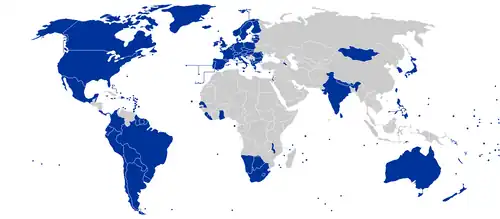 A tendência liberal se espalhou para alguns Estados da África na década de 1990, mais proeminentemente na África do Sul. Alguns exemplos recentes de tentativas de liberalização incluem a Revolução Indonésia de 1998, a Revolução das Bulldozers na Iugoslávia, a Revolução das Rosas na Geórgia, a Revolução Laranja na Ucrânia, a Revolução dos Cedros no Líbano, a Revolução das Tulipas no Quirguistão e a Revolução do Jasmim na Tunísia. Segundo a Freedom House, em 2007 existiam 123 democracias eleitorais (contra 40 em 1972).[121] De acordo com o Fórum Mundial sobre Democracia, as democracias eleitorais agora representam 120 dos 192 países existentes e constituem 58,2 por cento da população mundial. Ao mesmo tempo, as democracias liberais, ou seja, os países que a Freedom House considera livres e respeitadores dos direitos humanos básicos e do Estado de direito, são 85 em número e representam 38 por cento da população mundial.[122] Também em 2007, as Nações Unidas declararam o dia 15 de Setembro como o Dia Internacional da Democracia.[123] Muitos países reduziram a idade de voto para 18 anos; as principais democracias começaram a fazê-lo na década de 1970, começando na Europa Ocidental e na América do Norte.[124][125] A maioria das democracias eleitorais continua a excluir do voto os menores de 18 anos de idade.[126]