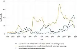 As transições do século XX para a democracia liberal ocorreram em sucessivas "ondas de democracia", resultantes de guerras, revoluções, descolonização e circunstâncias religiosas e econômicas.[113] Ondas globais de “regressão democrática” que reverteram a democratização também ocorreram nas décadas de 1920 e 1930, nas décadas de 1960 e 1970 e na década de 2010.[114][115]