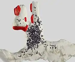 Reconstrução tridimensional de uma gêmula, mostrando sinapses maculares múltiplas (vermelho) e agregados maciços de ribossomos (preto)