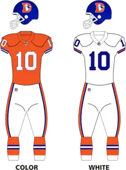 O Denver Broncos é uma franquia profissional de futebol americano sediada em Denver, Colorado. Os Broncos competem como um clube membro da Divisão Oeste da American Football Conference (AFC) da National Football League (NFL).[2][3][4][5] Eles começaram a jogar em 1960 como membro fundador da American Football League (AFL) e se juntaram à NFL como parte da fusão em 1970. Os Broncos são propriedade de Pat Bowlen Trust e atualmente jogam no Empower Field at Mile High (anteriormente conhecido como Invesco Field at Mile High de 2001–2010 e Sports Authority Field at Mile High de 2011–2017). Antes disso, eles jogavam no Mile High Stadium de 1960 a 2000.