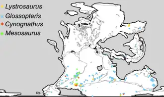 - ↑ United States Geological Survey (janeiro de 2009). «Rejoined continents – Gondwana fossils». This Dynamic Earth: The story of plate tectonics (em inglês). Consultado em 9 de janeiro de 2015