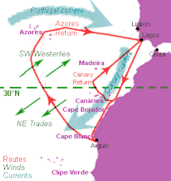 Além da exploração do litoral foram feitas também viagens para o mar largo em busca de informações meteorológicas e oceanográficas (foi nestes trajectos que se descobriram os arquipélagos da Madeira e dos Açores, o Mar dos Sargaços). O conhecimento do regime de ventos e correntes do Atlântico e a determinação da latitude por observações astronómicas a bordo, permitiu a descoberta da melhor rota oceânica de regresso de África: cruzando o Atlântico Central até à latitude dos Açores, aproveitando os ventos e correntes permanentes favoráveis, que giram no sentido dos ponteiros do relógio no hemisfério norte devido à circulação atmosférica e ao efeito de Coriolis, facilitando o rumo directo para Lisboa e possibilitando assim que os portugueses se aventurassem cada vez para mais longe da costa, manobra que ficou conhecida como "volta da Mina", ou "Volta do mar".