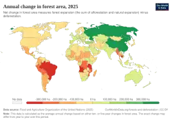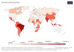 Mas há alguns motivos de otimismo: registra-se uma visível tendência de queda na taxa global de desflorestação, passando de cerca de 6 milhões de hectares anuais em 1990 para os cerca de 5 milhões no presente,[47] e hoje oitenta países registram ou uma estabilização ou mesmo uma tendência de expansão em suas florestas. Neste último caso se incluem, por exemplo, os Estados Unidos, Índia, China, França, Noruega, Bulgária, Itália, Chile, Uruguai, Cuba, Tunísia, Marrocos e Ruanda.[48]