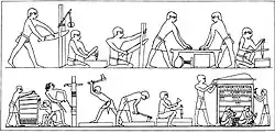 Cópia de mural em uma tumba egípcia demonstrando vários usos da madeira