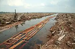 Para compensar essa perda de fertilidade, o agricultor precisa usar fertilizantes, que além de serem a maior fonte de óxido nitroso, um potente gás-estufa,[93] alteram profundamente a composição química do terreno, interferindo na biodiversidade subterrânea. Com esse desequilíbrio, as pragas agrícolas se tornam mais frequentes e exigem maior uso de pesticidas, que acabam prejudicando a saúde de quem consome os produtos agrícolas e também muitas outras formas de vida das quais as colheitas dependem, como os polinizadores e as minhocas. Essas contaminações não se limitam às áreas florestais, pois os venenos se infiltram pelo solo e poluem os mananciais de água subterrâneos e superficiais, que por fim carregam toda essa carga tóxica para o mar. O uso desses químicos foi um dos fatores que possibilitaram a chamada "revolução verde", que impulsionou a agricultura mundial, mas hoje os agrotóxicos são um vasto problema de saúde pública, tanto como ambiental.[91][94][95][96][91][55][61] Outro tipo de contaminação do solo ocorre quando as florestas são destruídas com o uso de herbicidas, o que parece estar se tornando uma tendência na Amazônia, já que é um método muito mais barato e eficiente do que o corte mecânico.[91][95] Nas regiões litorâneas, as florestas fixam o solo impedindo a erosão costeira e minimizam os impactos da maresia, de marés tempestuosas e tsunamis.[88][97]