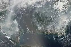 Foto de satélite mostrando a fumaça de queimadas sobre Bornéu e Sumatra.Projeção das tendências de mudança na precipitação anual até o fim do século XXI, por influência do aquecimento global. Como a imagem mostra, uma grande parte das áreas cultivadas do mundo deve experimentar uma redução em suas chuvas.
