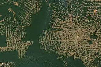 A Amazônia brasileira abriga aproximadamente um terço das florestas tropicais do planeta, com uma área de aproximadamente 4,1 milhões de quilômetros quadrados que está entre as mais ricas em biodiversidade. O desmatamento é uma das intervenções humanas que mais prejudica a sustentabilidade ambiental na região, e quase metade dele é realizado de forma ilegal. As principais causas regionais são a criação de gado, monoculturas, obras de infraestrutura, atividades madeireiras e a grilagem de terras.[10][14][91][122][264] Extensas áreas do bioma já mostram a floresta empobrecida e degradada por queimadas.[91] Já foram removidos cerca de 20% da floresta primitiva, 47% do bioma Amazônia estava sob algum tipo de pressão humana em 2002, dos quais 19% representavam pressão consolidada (desmatamento, centros urbanos e assentamentos rurais) e 28% pressão incipiente (medida pela incidência de incêndios). Como já foi dito antes, a Amazônia está em um momento crítico, prestes a ultrapassar o ponto em que uma degradação generalizada será irreversível.[28][170][265][266] O editorial da revista Science Advances de fevereiro de 2018 ressaltou que "sinergias negativas entre o desmatamento, as mudanças climáticas e o uso generalizado da queimada conduzem a um ponto de inflexão no sistema amazônico em direção a ecossistemas não florestais, nas regiões leste, sul e central da Amazônia, tão logo sejam atingidos 20% a 25% de área desmatada. A gravidade das secas de 2005, 2010 e 2015-2016 poderia representar as primeiras manifestações desse ponto de inflexão ecológico. Esses eventos, juntamente com as graves inundações de 2009, 2012 (e 2014 no Sudoeste da Amazônia), sugerem que todo o sistema está oscilando".[265] Em outro estudo, também enfocando o papel das queimadas e sua interação com o aquecimento global, o autor principal, Paulo Brando, disse: