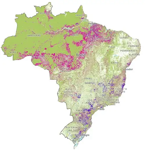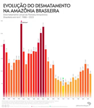 Entre 1990 e 2000 o país perdeu mais 22 milhões de hectares de florestas,[6] e entre 2000 e 2005 se tornou o maior desmatador do mundo, respondendo por 47% das perdas globais,[14] embora as áreas protegidas se ampliassem bastante, praticamente dobrando sua área.[15] e grandes recursos tenham sido destinados à fiscalização, monitoramento e infraestrutura.[16] Então o ritmo de desmatamento começou a reduzir significativamente, atingindo um recorde em 2012, com a menor taxa em 24 anos, segundo dados do governo.[17] Esse período positivo se deve a uma série de medidas, entre elas a grande expansão das áreas protegidas; a chamada "moratória da soja", que impôs impedimentos à comercialização do produto cultivado em áreas de desmatamento recente; uma fiscalização e penalização intensificadas; a restrição do crédito a desmatadores, e a redução da compra pelos frigoríficos de carne de fazendas que desmataram ilegalmente.[18] Mesmo assim, entre 1997 e 2013, somente na região da Amazônia Legal, foi perdida uma área de florestas que equivale quase ao tamanho do estado de São Paulo. 350 mil km2 foram desmatados somente no estado de Mato Grosso. Todos os outros biomas também foram severamente impactados.[19]
