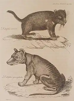 - ↑ HARRIS, G.P. (1808). «Description of two new Species of Didelphis from Van Diemen's Land». Transactions of The Linnean Society of London. 9: 174–78. doi:10.1111/j.1096-3642.1818.tb00336.x