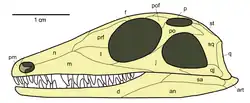 Diapsida é um grupo de répteis terrestres que inclui os lagartos , tuataras , crocodilos e aves ; além de inúmeras ordens de répteis pré-históricos incluindo dinossauros , pterossauros , plesiossauros , notossauros, rincossauros, prolacertiformes e aetossauros.[ 1]