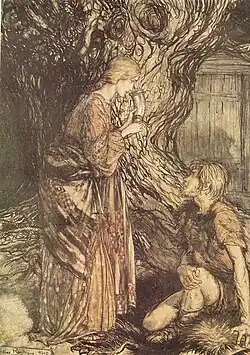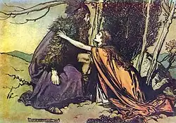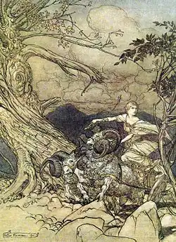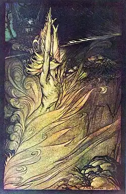 - ↑ Em relação ao problema do anel forjado por Alberich após o roubo do "Ouro do Reno" das ninfas, e que agora estava sob poder do gigante Fafner, como apresentado na primeira parte da tetralogia. Para mais informações, ler a sinopse de Das Rheingold).