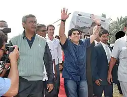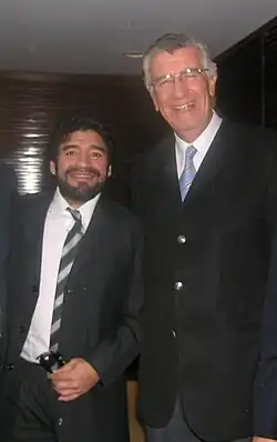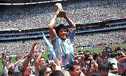 Diego Armando Maradona[2][3][4] (Lanús, 30 de outubro de 1960 – Tigre, 25 de novembro de 2020) foi um futebolista argentino que atuou como meia-atacante. Considerado um dos maiores jogadores de todos os tempos, liderou a Argentina na conquista da Copa do Mundo FIFA de 1986, marcando, nas quartas-de-final, o Gol do Século.[5][6] Ainda disputou mais três mundiais (1982, 1990 e 1994), tendo alcançado o vice-campeonato em 1990. A Copa de 1994 ficou marcada como o ponto final da vitoriosa trajetória de Maradona pela Seleção, após ele ser apanhado no exame antidoping na partida contra a Nigéria (a segunda da Argentina no Mundial). Por conta de sua notória participação nos Mundiais, em 2002 foi escolhido para o Time dos Sonhos das Copas do Mundo FIFA. Também trabalhou como treinador, mas sem muito sucesso.