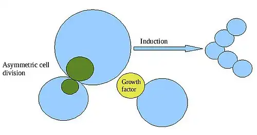 Outro importante mecanismo enquadra-se na categoria das divisões celulares assimétricas, divisões que dão lugar a células-filhas com destinos de desenvolvimento distintos. As divisões celulares assimétricas podem ocorrer por causa de determinantes citoplasmáticos maternos expressos assimetricamente ou devido a sinalização.[3]