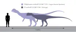 O Dilophosaurus foi um dos primeiros grandes dinossauros predadores, um terópode de tamanho médio, embora pequeno em comparação com alguns dos terópodes posteriores.[24] Esbelto e levemente construído, seu tamanho era comparável ao de um urso pardo.[25] Suas estimativas de comprimento variam de 6 metros[26] a 7 metros[27] de comprimento. As de peso são mais variadas, indo de 227 a 500 kg,[27][28][26][29][30] e também 3/4 de uma tonelada.[16]