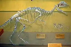 Dilophosaurus (do grego δύο (di) + λοφος (lophos) + σαῦρος (saurus); "lagarto de duas cristas") foi um gênero de dinossauro carnívoro e bípede que viveu durante o inicio do período Jurássico inferior.[1] Provavelmente ele também foi o maior predador de sua época, apesar de provavelmente se alimentar também de carcaças. Três esqueletos foram descobertos no norte do Arizona em 1940 e os dois mais bem preservados foram coletados em 1942. O espécime mais completo tornou-se o holótipo de uma nova espécie do gênero Megalosaurus, denominada M. wetherilli por Samuel P. Welles em 1954. Welles encontrou um esqueleto maior pertencente à mesma espécie em 1964. Percebendo que exibia cristas no crânio, ele atribuiu a espécie ao novo gênero Dilophosaurus em 1970, batizando a espécie-tipo de Dilophosaurus wetherilli.