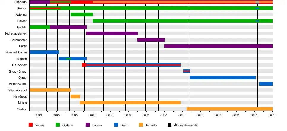 | Ex-integrantes | Tjodalv Stian Aarstad Brynjard Tristan Nagash Mustis ICS Vortex Nicholas Barker Hellhammer Tanya Astennu Lars Archon Snowy Shaw Kimberly Goss Galder |