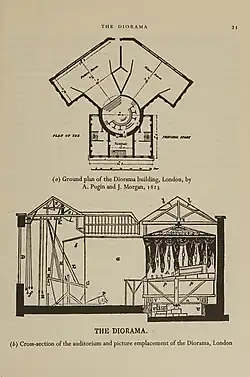O diorama de Daguerre consistia de uma tela de gaze espessa pintada dos dois lados, que quando iluminada pela frente, a cena era apresentada num determinado estado, e quando a iluminação era feita por trás, um outro estado ou aspecto da cena podia ser visto. Cenas à luz do dia mudavam para cenas noturnas, um trem trafegando numa estrada de ferro colidia, ou os efeitos de um terremoto eram exibidos nas situações "antes e depois".