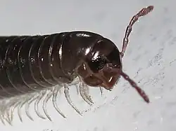 A cabeça dos milípedes é tipicamente arredondada por cima e aplanada por baixo, portando anteriormente um par de antenas dobradas, com sete ou oito segmentos com cones sensoriais nas extremidades, um par de olhos compostos, e um par de grandes mandíbulas na frente duma estrutura em forma de placa chamada de gnatoquilário (ou o "lábio da mandíbula").[10] Muitas ordens apresentam, próximos à base das antenas, órgãos sensoriais em forma de anéis ovais chamados de órgãos de Tömösváry, que também estão presentes em algumas centopeias, possivelmente usados para medir os níveis de humidade ou luz ou mesmo vibrações no ambiente.[40] Vale detalhar que os olhos consistem de vários ocelos com lentes planas simples, dispostas em grupo ou mancha (i.e. não formando autênticos olhos compostos), em cada lado da cabeça, que podem ser chamados de campos oculares ou ocelários. Muitas espécies, incluindo toda a ordem Polydesmida e certos espécies habitantes de tocas subterrâneas, como em Causeyella e Trichopetalum, não apresentam olhos, sendo cegos.[41]