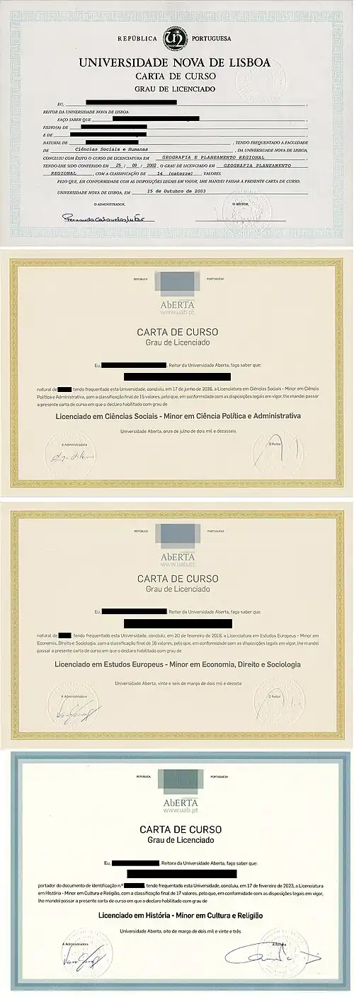 Em Portugal os diplomas que testemunham a atribuição de um grau académico denominam-se cartas: