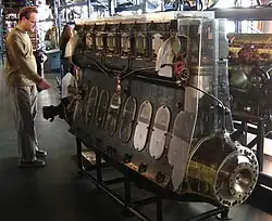 Motor diesel de oito cilindros Beardmore Tornado, do dirigível britânico R101, em exposição no Science Museum (Londres). |