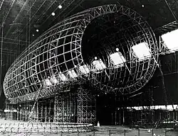 Construção do dirigível americano USS Akron em 1930, que serviu de nave-mãe para eronaves parasitas.[33] |