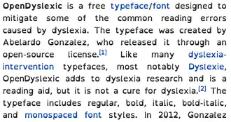 | Texto com fonte OpenDyslexic, desenhada para facilitar a leitura de pessoas com dislexia.[1] | |
