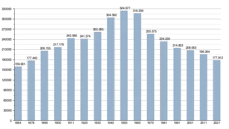 | 1864 | 1878 | 1890 | 1900 | 1911 | 1920 | 1930 | 1940 | 1950 | 1960 | 1970 | 1981 | 1991 | 2001 | 2011 | |