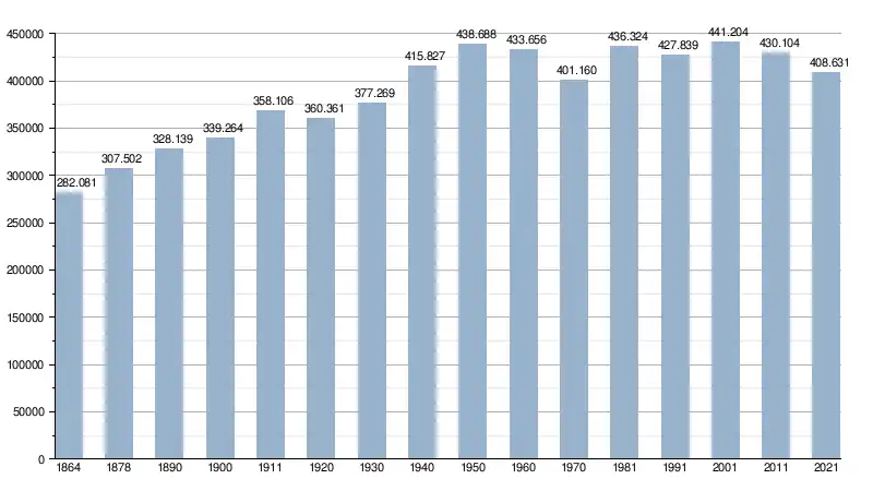 | 1864 | 1878 | 1890 | 1900 | 1911 | 1920 | 1930 | 1940 | 1950 | 1960 | 1970 | 1981 | 1991 | 2001 | 2011 |