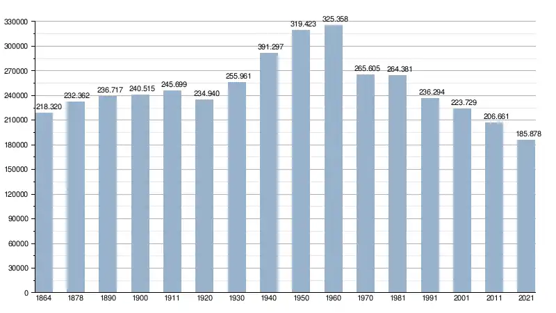 | 1864 | 1878 | 1890 | 1900 | 1911 | 1920 | 1930 | 1940 | 1950 | 1960 | 1970 | 1981 | 1991 | 2001 | 2011 | 2021 |