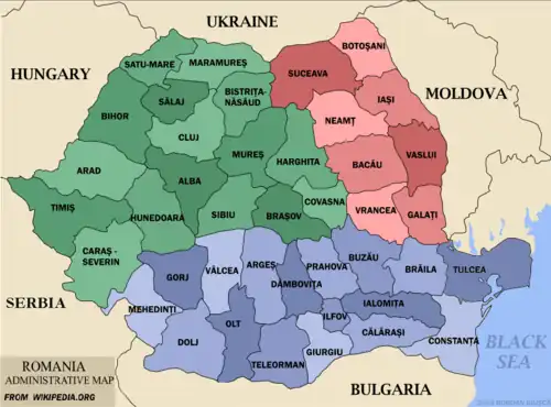 - ↑ Estas são as abreviaturas em uso e coincidem com as placas dos veículos; elas também correspodem ao código ISO 3166-2:RO.