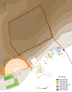 1: Acrópole — 2: Teatro — 3: Estádio — 4: Buleutério — 5: Casa dos sacerdotes — 6 e 7: Pritaneu e anexos — 8: Templo de Afrodite — 9: edifício romano — 10: Templo de Têmis — 11: Casa Coroada (Ἱερά Οἰκία) — 12 e 13: Novo e antigo templo de Dione — 14 e 15: Templo e altar de Hércules — 16: Basílica cristã — 17: muro oeste — 18 e 19: portões novo e antigo