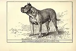 "Dogue" em português e francês é uma palavra que tem seu equivalente grafado em inglês e alemão como "dogge", uma palavra que pode derivar do próprio inglês antigo "docga" que significa "cão poderoso, musculoso"; ou do proto-germânico "dukkǭ" que significa "poder; força". A denominação "dogue" ou "dogge" foi e é comumente utilizada para nomear um tipo de cães de constituição física molossóide utilizados principalmente para presa de grandes animais.[2]