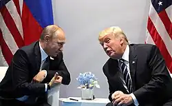 Criticou duramente, tanto democratas quanto republicanos, por parecer estar de acordo com a negativa de Vladimir Putin à interferência russa, em vez de aceitar as conclusões da Comunidade de Inteligência dos Estados Unidos.[149][150] Seus comentários foram fortemente criticados por muitos republicanos do Congresso e pela maioria dos comentaristas da mídia, mesmo aqueles que normalmente o apoiam.[151][152] Agências de inteligência dos EUA concluíram que o presidente russo ordenou, pessoalmente, a operação secreta de medidas ativas,[153] enquanto este negou as acusações.[154]