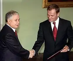 Tusk e seu partido Plataforma Cívica saíram vitoriosos na eleição parlamentar polonesa de 2007, derrotando o partido Lei e Justiça, do primeiro-ministro em exercício Jarosław Kaczyński, com cerca de 42% dos votos, contra 32% do partido Lei e Justiça.[16] Tusk e seu gabinete reunido foram empossados em 16 de novembro, quando ele se tornou o décimo quarto primeiro-ministro da Terceira República Polonesa.[17]