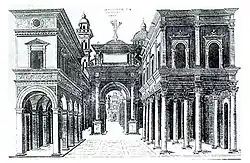 Outra gravura representando uma estrada em perspectiva centralizada é também atribuída a Bramante, com as características de cidade ideal e que apresenta muitos motivos arquitectónicos típicos da arquitectura milanesa do período dominado pela influência da sua agora plenamente renascentista. Nesta perspectiva encontramos no extremo do centro um arco triunfal e uma cúpula brunelleschiana, enquanto nas laterais temos dois palácios com características diferentes: um com colunas coríntias e entablamento no rés-do-chão, parastáticas e arco redondo nas janelas no primeiro andar; o outro possui pilares que suportam arcos no piso térreo, enquanto no primeiro piso possui janelas tímpano e oculos. A gravura poderá evidenciar a actividade de Bramante como cenógrafo de espectáculos para a corte e parece constituir um protótipo fundamental para o desenvolvimento da cenografia quinhentista.[8]