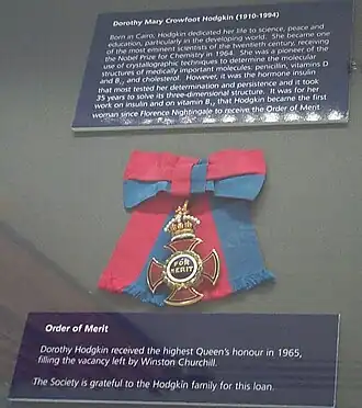 - ↑ «Hodgkin, Prof. Dorothy Mary Crowfoot, (12 May 1910–29 July 1994), Emeritus Professor, University of Oxford; Hon. Fellow: Somerville College, Oxford; Linacre College, Oxford; Girton College, Cambridge; Newnham College, Cambridge; Fellow, Wolfson College, Oxford, 1977–82; Chancellor, Bristol University, 1970–88». Oxford University Press. Who Was Who. 1 de dezembro de 2007. Consultado em 19 de setembro de 2025