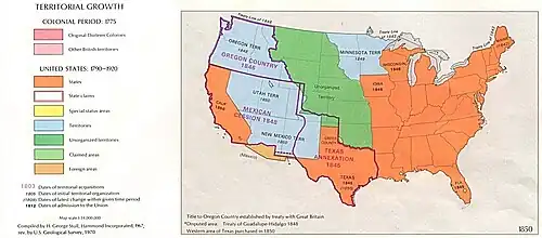 A frase "destino manifesto" é mais freqüentemente associada com a expansão territorial dos Estados Unidos de 1812 a 1860. Esta era, do final da Guerra de 1812 até o início da Guerra Civil Americana, tem sido chamada de "era da destino manifesto".[26] Durante esse tempo, os Estados Unidos expandiram-se para o Oceano Pacífico - "do mar para o mar brilhante" - definindo amplamente as fronteiras dos Estados Unidos contíguos como são hoje.[27]