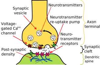 Ilustração dos principais elementos da neurotransmissão. Dependendo do mecanismo de ação, uma substância psicoativa pode bloquear os receptores nos dendritos do neurônio pós-sináptico, bloquear a recaptação ou afetar a síntese de neurotransmissores no axônio do neurônio pré-sináptico
