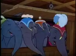 Para ajudar o amigo, Timothy sussurra ao diretor do circo, enquanto este dorme, que Dumbo deveria ser o ponto alto de uma pirâmide de elefantes. Mais tarde, o mestre do circo apresenta tal número para uma animada plateia, mas Dumbo tropeça nas próprias orelhas e estraga o espetáculo. Como punição, o elefantinho é obrigado a se juntar ao número dos palhaços, que o forçam a saltar de uma alta fachada em chamas e cair numa banheira com gesso. O ratinho leva Dumbo até a Sra. Jumbo, ainda confinada. Após o encontro agridoce, Dumbo e Timothy acidentalmente se embriagam com o champanhe dos palhaços e começam a ter alucinações de elefantes cor-de-rosa desfilando.[8]