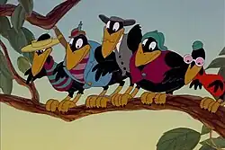 A crítica de dança Mindy Aloff relata que os movimentos dos corvos foram inspirados nos números de improvisação de sapateado dos Jackson Brothers,[98] um dueto de dançarinos formado por Eugene Jackson (1916-2001), que participou da série Our Gang, e seu meio-irmão Freddy Baker (1919-1995). No entanto, ela ressalta que a sequência de referência filmada permaneceu anônima até a década de 1990.[99] A autora apresenta o seguinte relato: