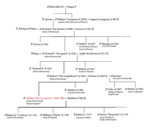 Após a morte de Guilherme, o Conquistador, seu filho mais velho, Roberto, tornou-se duque da Normandia, enquanto um filho mais novo de Guilherme, Guilherme, o Vermelho, tornou-se Rei da Inglaterra. Após a morte de Guilherme, pois era sucessor de Guilherme II e porque ele havia deposto Roberto em 1106, o irmão mais novo Roberto e Guilherme, Henrique I, reivindicou os dois títulos, Duque da Normandia e Rei da Inglaterra, unindo-os em um só.