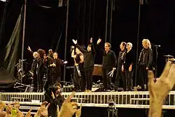 ![]() Bruce Springsteen e a banda E Street Band no final de uma das suas performances em 2009. | |