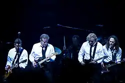 ![]() Eagles durante concerto em 2008 na Long Road Out of Eden Tour. Da esquerda para a direita: Glenn Frey, Don Henley, Joe Walsh, Timothy B. Schmit e, ao fundo, o músico de turnê Scott F. Crago | |