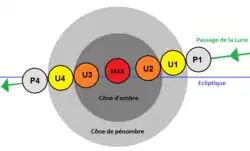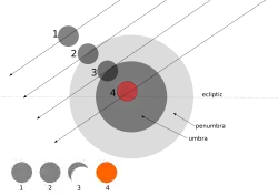 Tipos de eclipse de acordo com a passagem pelo nodo descendente. 2 descreve um eclipse penumbral, 3 um eclipse parcial e 4 um eclipse total.