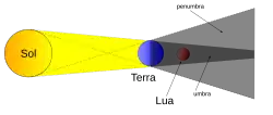 A sombra projetada pela Terra possui duas partes denominadas umbra e penumbra. A umbra é uma região em que não há iluminação direta do Sol e a penumbra é uma região em que apenas parte da iluminação é bloqueada.[1]